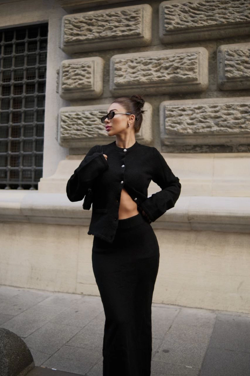 Luviroli Düğmeli Triko İkili Etekli Takım- Siyah