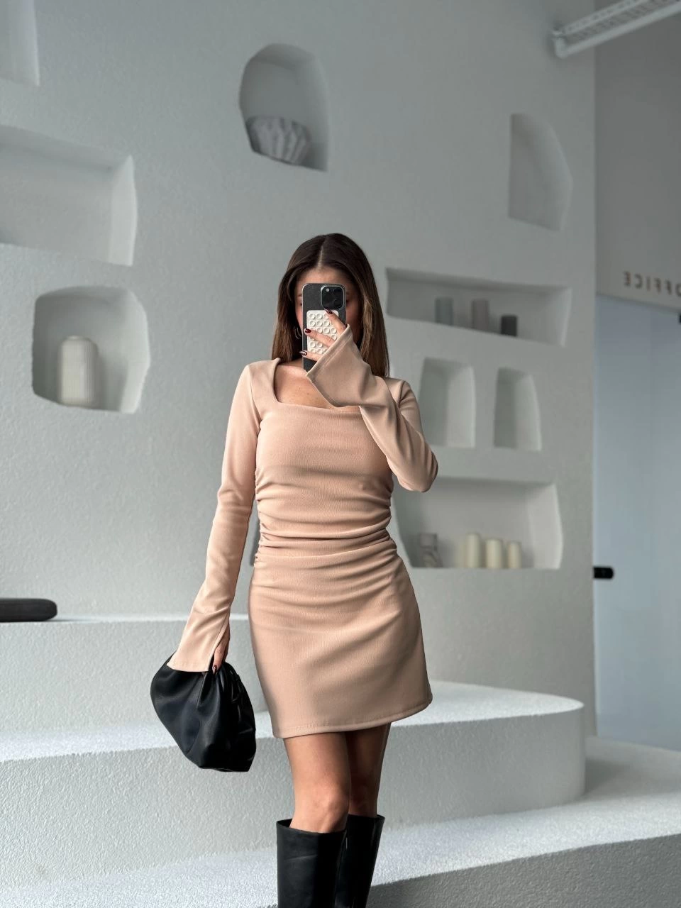 Luviroli Kare Yaka Mını Boy Fitilli Elbise - Bej