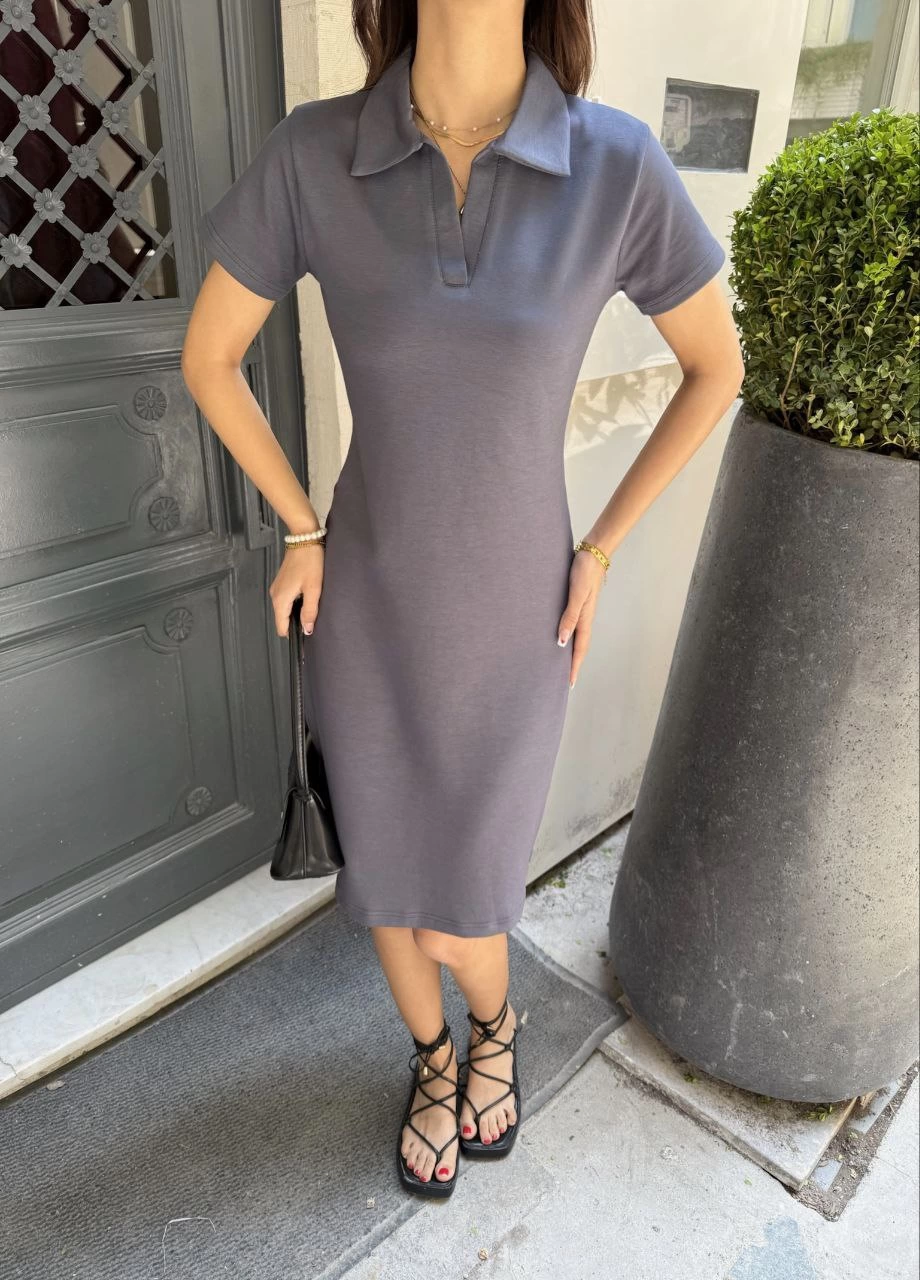 Luviroli Osy Modal Yumuşak Dokulu Kumaş Yakalı Kısa Kollu Elbise - Füme