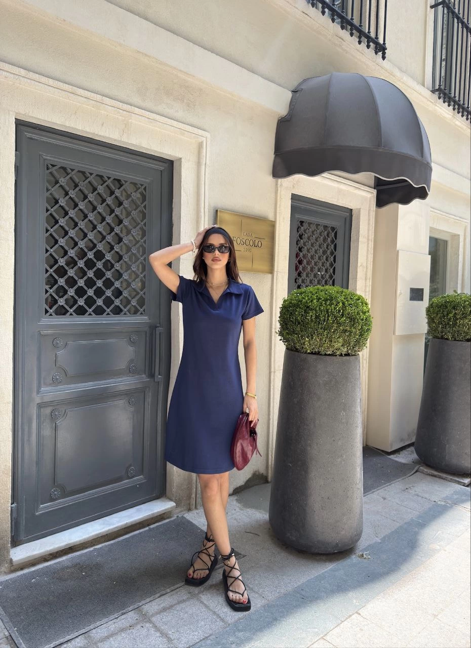 Luviroli Osy Modal Yumuşak Dokulu Kumaş Yakalı Kısa Kollu Elbise - Mavi