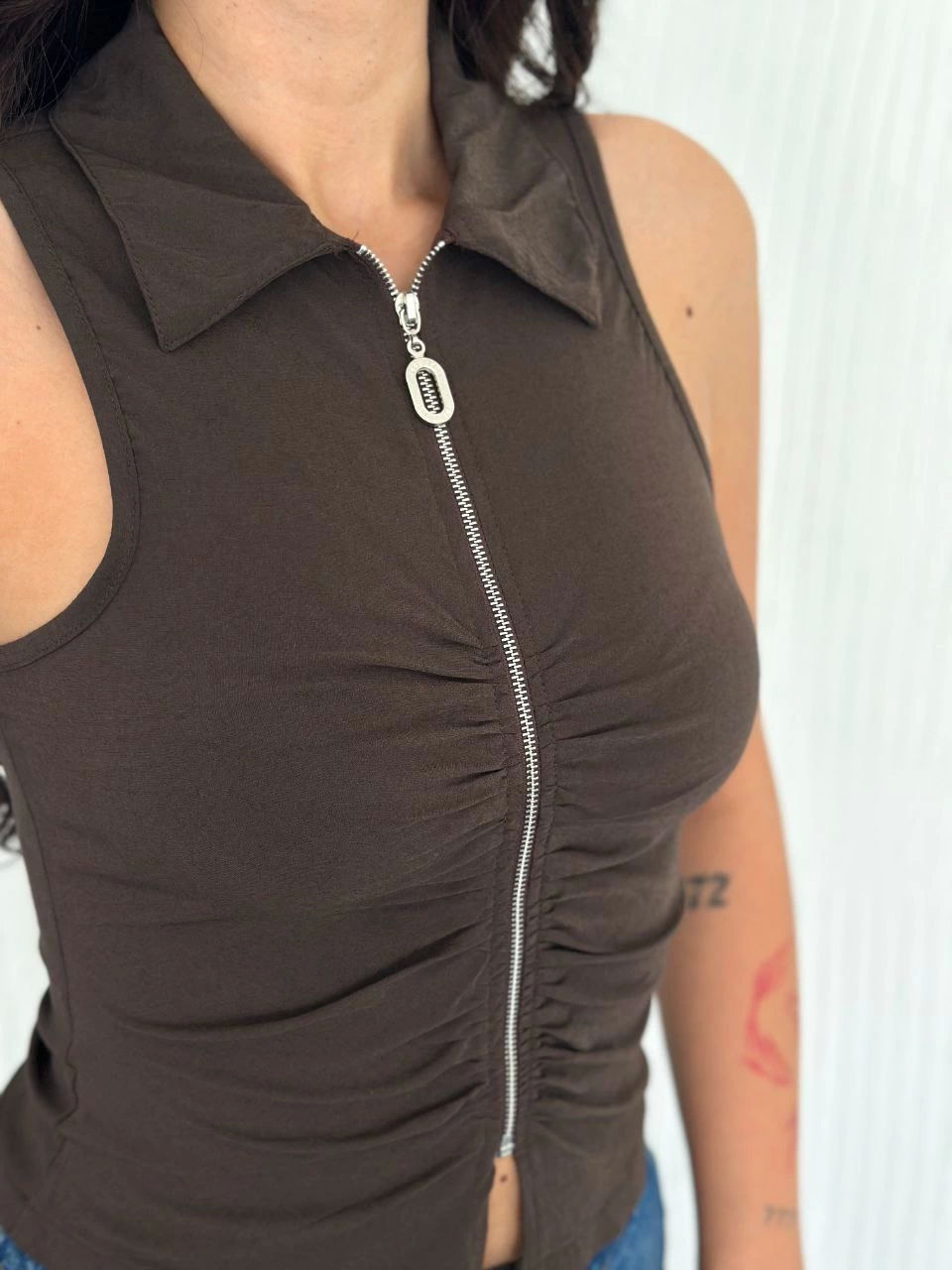 Luviroli Yakalı Tam Fermuarlı Kolsuz Bluz - Kahverengi